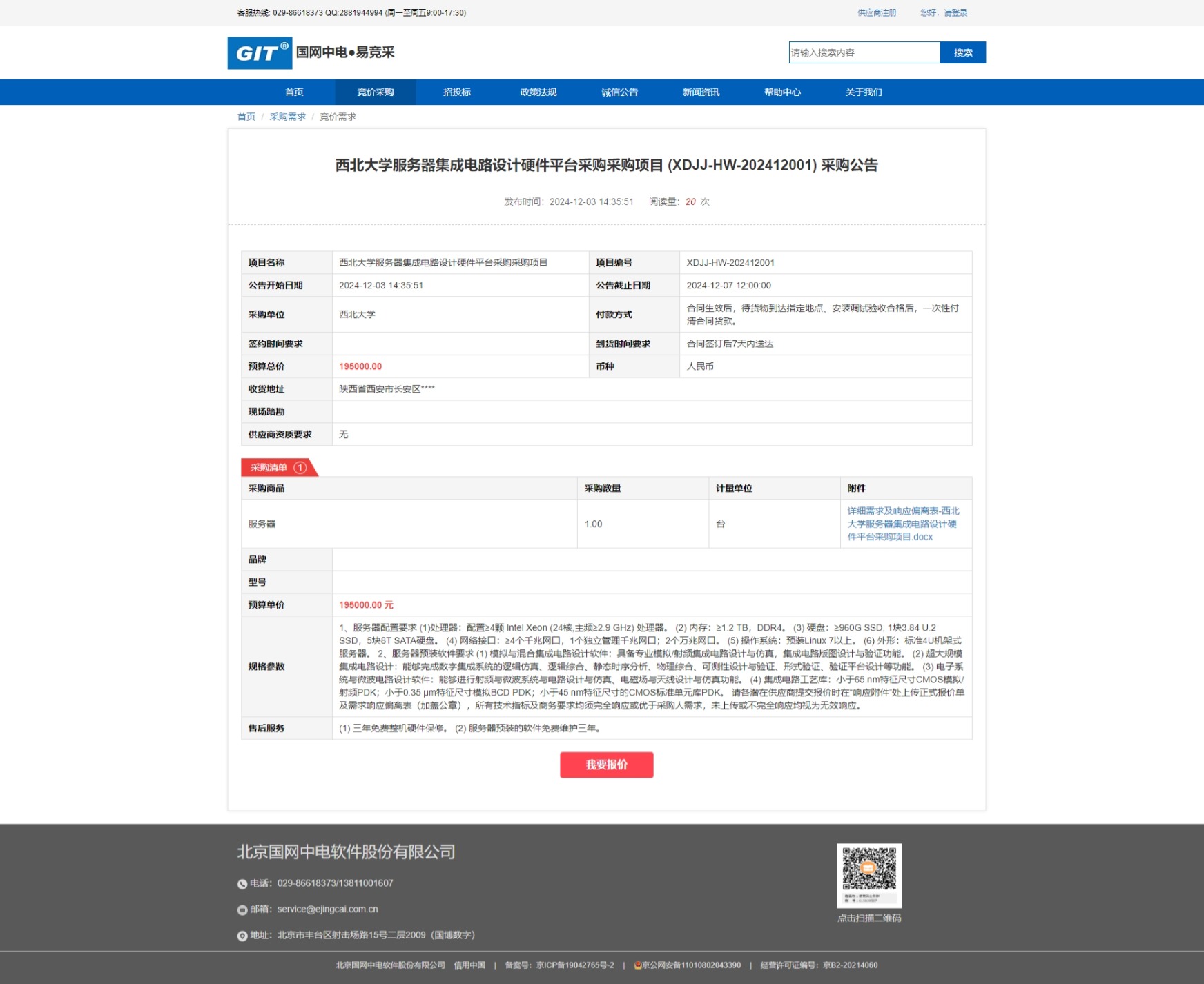 8868体育登录服务器集成电路设计硬件平台采购采购项目 (XDJJ-HW-202412001) 竞价采购公告 作者: 编辑:薛利娟 时间:2024-12-03 原公告链接:https://www.ejingcai.com.cn/site/bidding/detail/15610