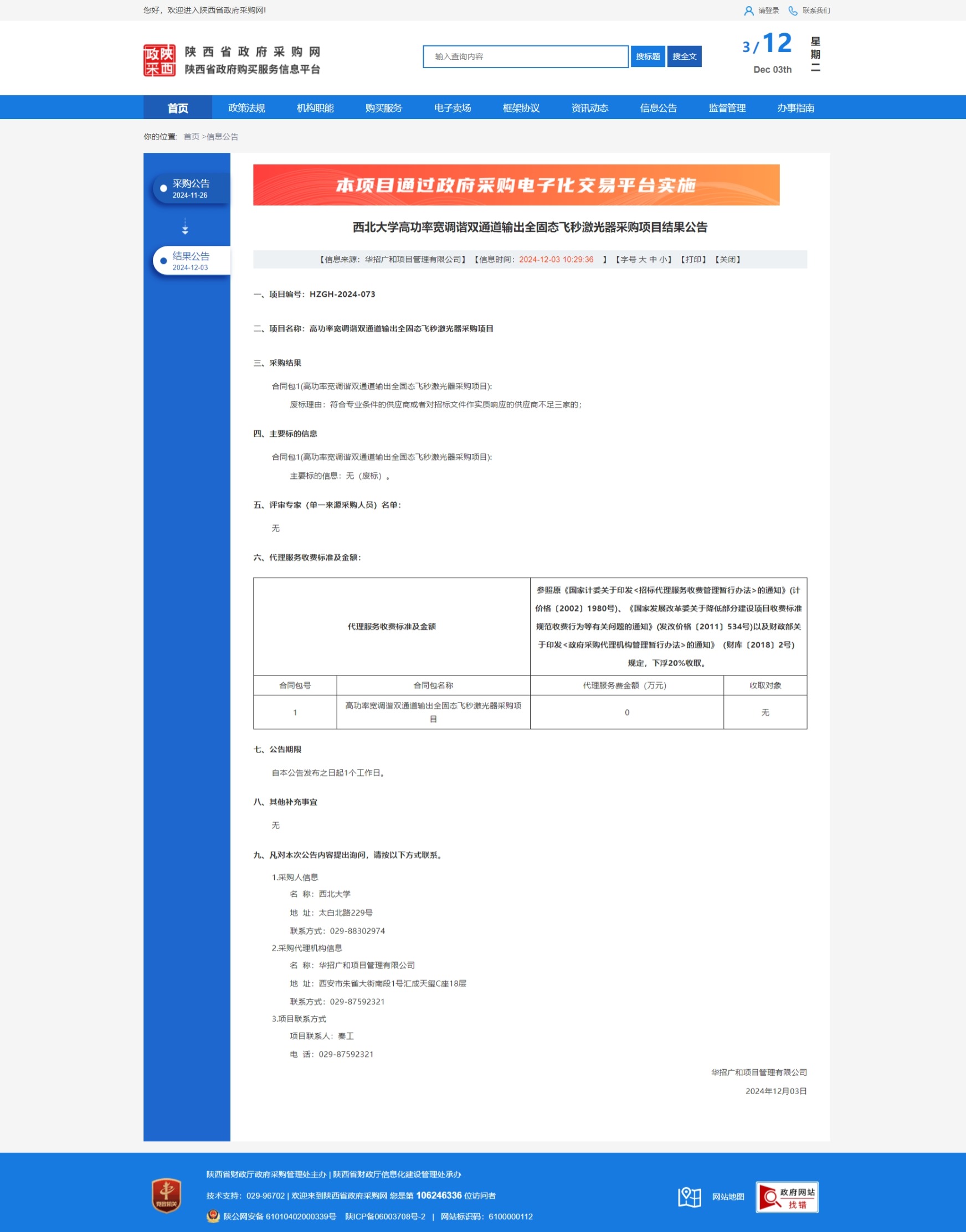 8868体育登录高功率宽调谐双通道输出全固态飞秒激光器采购项目结果公告 作者: 编辑:薛利娟 时间:2024-12-03 原公告链接:https://www.ccgp-shaanxi.gov.cn/freecms/site/shaanxi/ggxx/info/2024/8a69c44e9218572b01938a420ac318f6.html?noticeType=001006¬iceId=0b2e14ba-b120-11ef-8063-08c0eb20c666