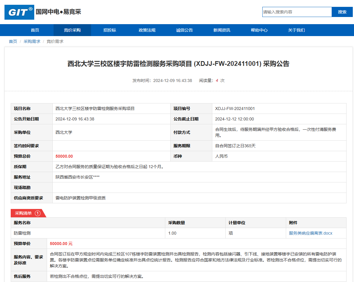 8868体育登录三校区楼宇防雷检测服务采购项目(XDJJ-FW-202411001)采购公告 作者:采购与招标办公室 编辑: 时间:2024-12-09 原公告链接:https://www.ejingcai.com.cn/site/bidding/detail/15824