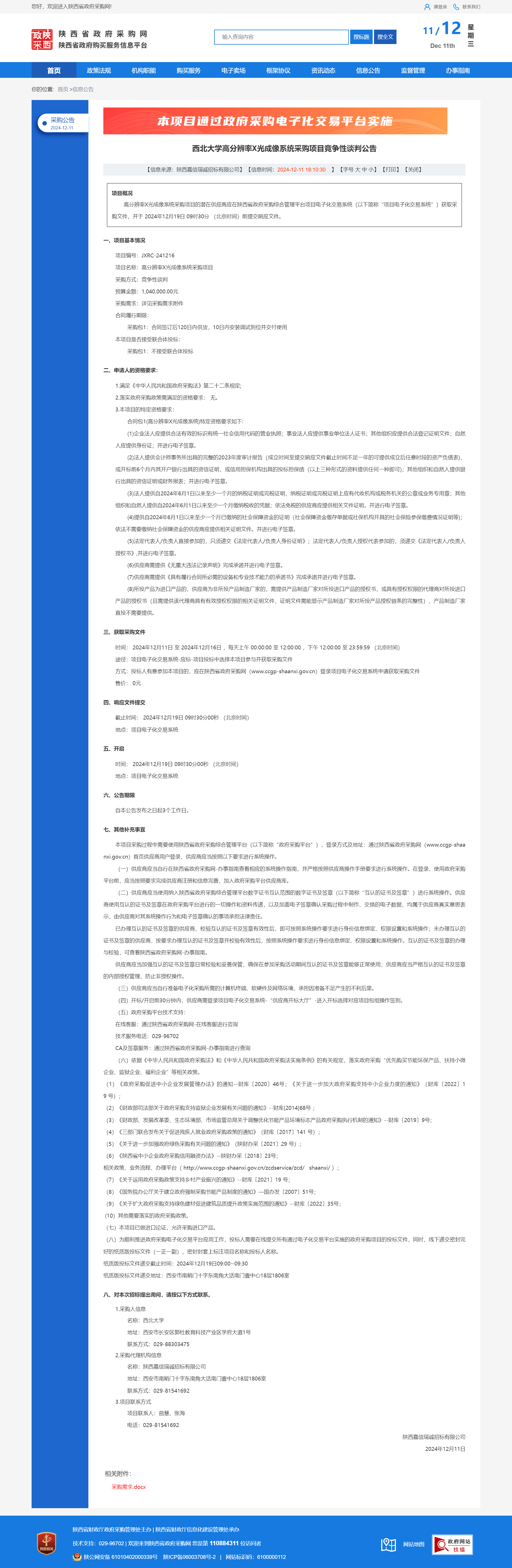 8868体育登录高分辨率X光成像系统采购项目竞争性谈判公告 作者:采购与招标办公室 编辑: 时间:2024-12-11 原公告链接:https://www.ccgp-shaanxi.gov.cn/freecms/site/shaanxi/ggxx/info/2024/8a69c251921857370193b5010b9638d3.html?noticeType=001013¬iceId=c4fa68de-b7a9-11ef-8063-08c0eb20c666