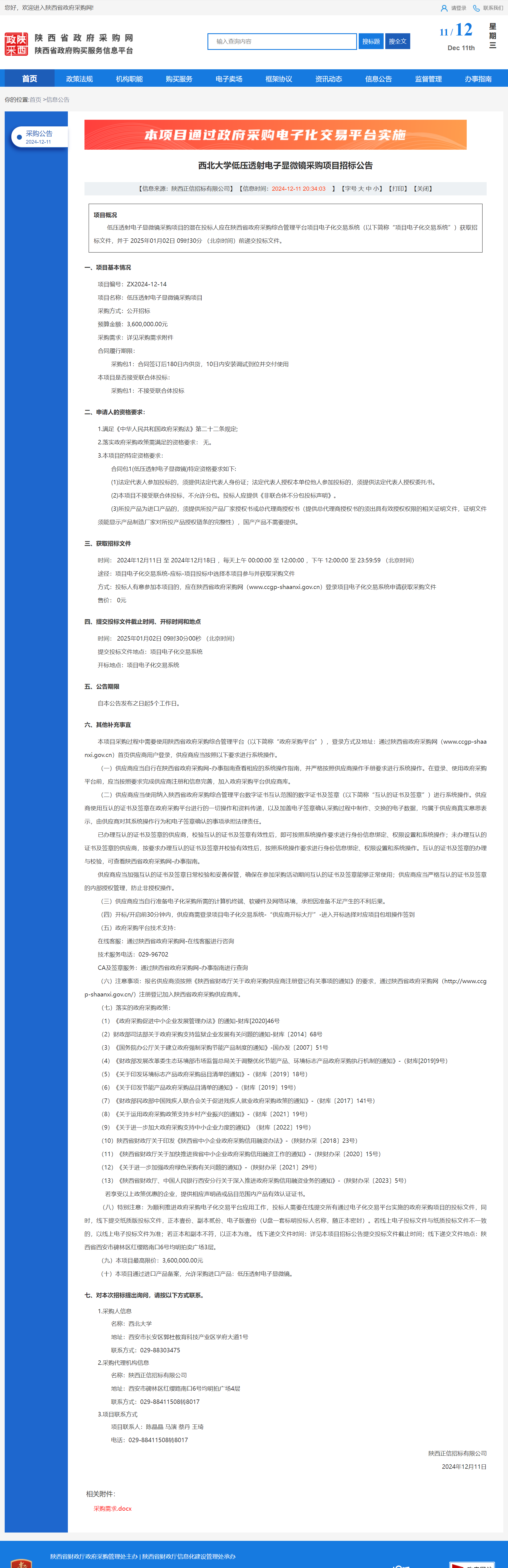 8868体育登录低压透射电子显微镜采购项目招标公告 作者:采购与招标办公室 编辑: 时间:2024-12-11 原公告链接:https://www.ccgp-shaanxi.gov.cn/freecms/site/shaanxi/ggxx/info/2024/8a69c251921857370193b58a2eef18ef.html?noticeType=001011¬iceId=d31c6b03-b7bd-11ef-8063-08c0eb20c666