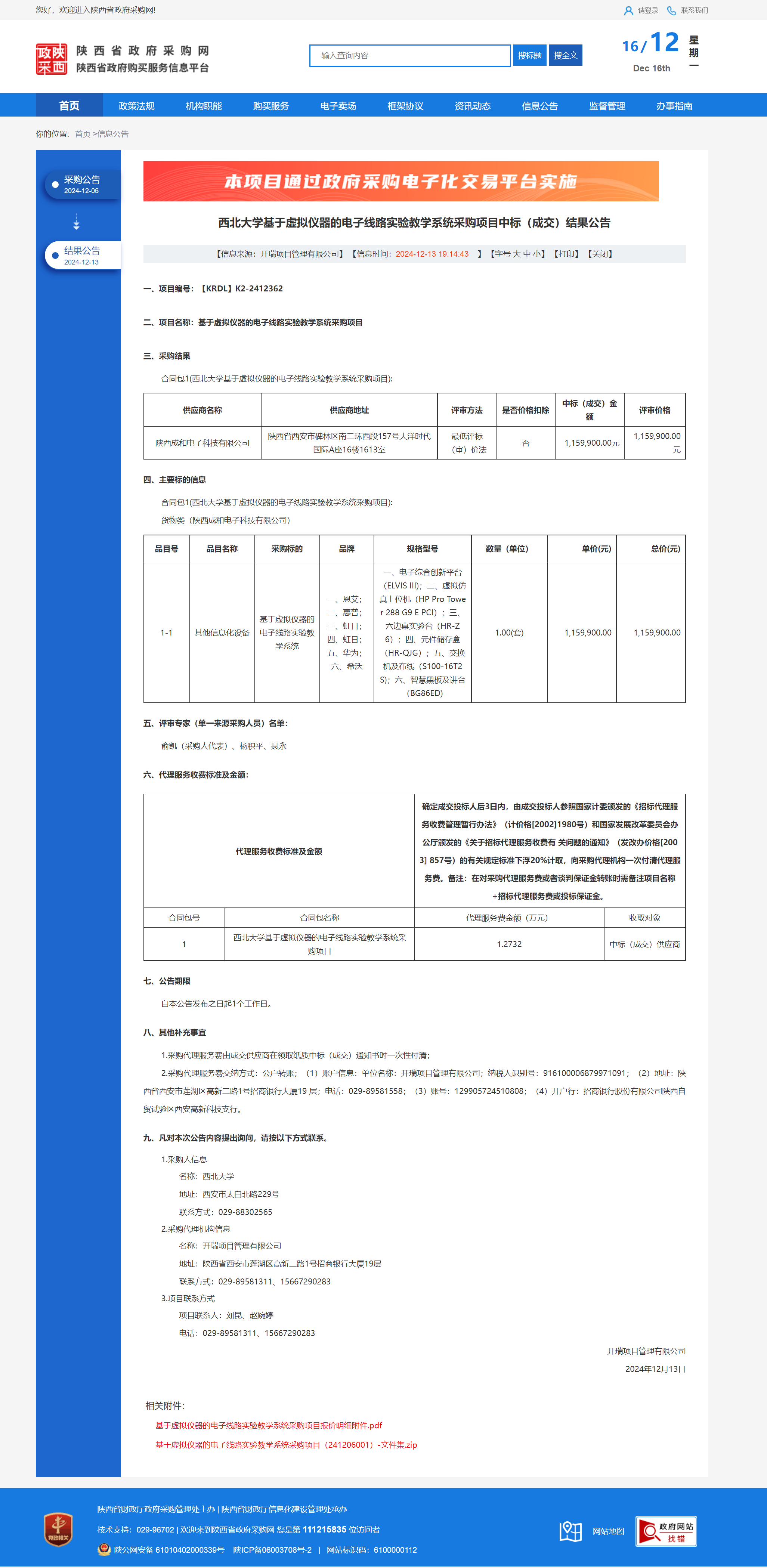 8868体育登录基于虚拟仪器的电子线路实验教学系统采购项目中标(成交)结果公告