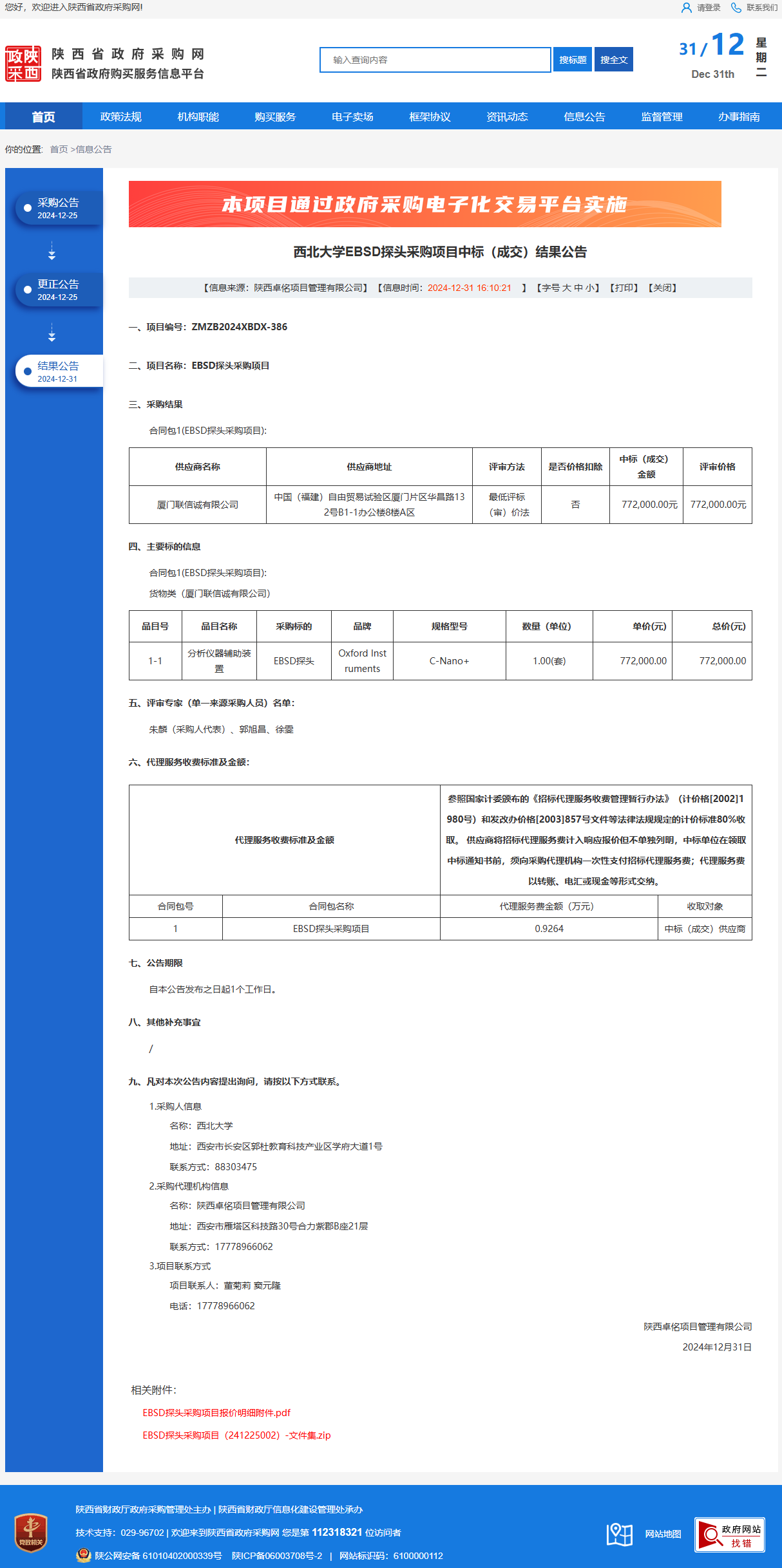 8868体育登录EBSD探头采购项目中标(成交)结果公告 作者:采购与招标办公室 编辑: 时间:2024-12-31 原公告链接:https://www.ccgp-shaanxi.gov.cn/freecms/site/shaanxi/ggxx/info/2024/8a69c44e9218572b01941bbf3cfd0e2a.html?noticeType=001023¬iceId=56151531-c750-11ef-8063-08c0eb20c666