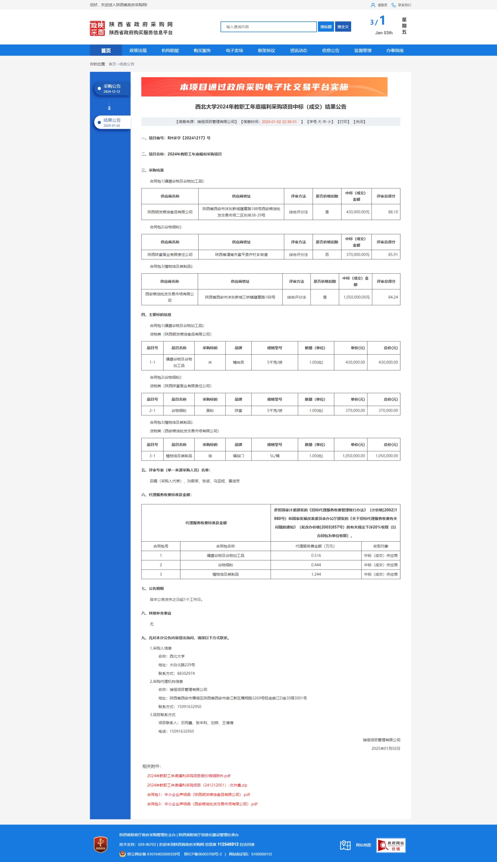 8868体育登录2024年教职工年底福利采购项目中标(成交)结果公告 作者: 编辑:薛利娟 时间:2025-01-03 原公告链接:https://www.ccgp-shaanxi.gov.cn/freecms/site/shaanxi/ggxx/info/2025/8a69c95d921859f001942760b68b1aa7.html?noticeType=001021¬iceId=57f4954f-c91b-11ef-8063-08c0eb20c666