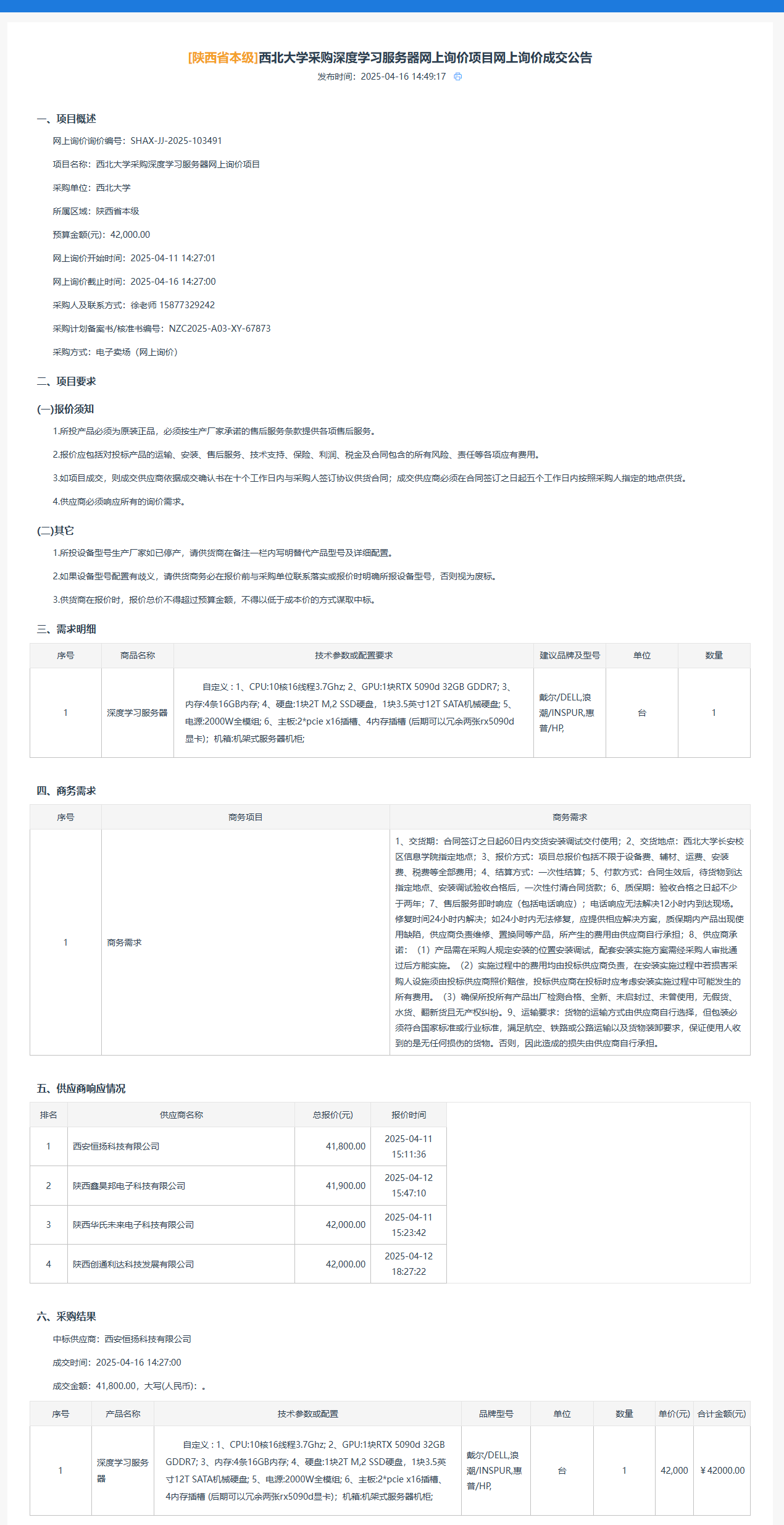 8868体育登录采购深度学习服务器网上询价项目网上询价成交公告 作者:采购与招标办公室 编辑: 时间:2025-04-23 原公告链接:https://www.ccgp-shaanxi.gov.cn/gpmall-main-web/basic/noticeDetail?noticeGuid=7311545629157818368