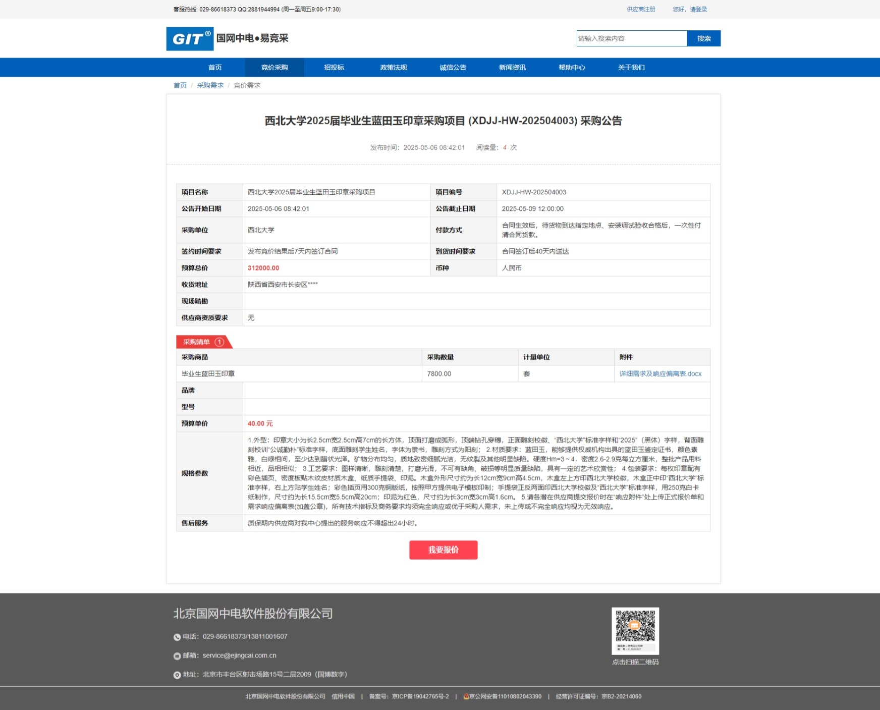 8868体育登录2025届毕业生蓝田玉印章采购项目 (XDJJ-HW-202504003) 竞价采购公告 作者: 编辑:采购与招标办公室 时间:2025-05-06 原公告链接:https://www.ejingcai.com.cn/site/bidding/detail/18026