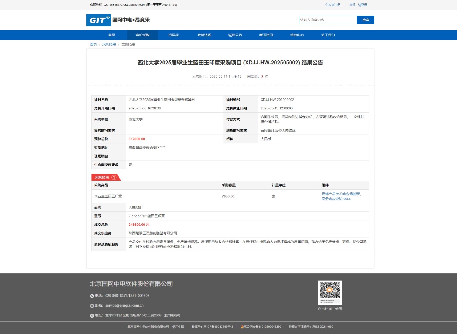 8868体育登录2025届毕业生蓝田玉印章采购项目 (XDJJ-HW-202505002) 竞价结果公告 作者: 编辑:采购与招标办公室 时间:2025-05-14 原公告链接:https://www.ejingcai.com.cn/site/bidding/detail/18215