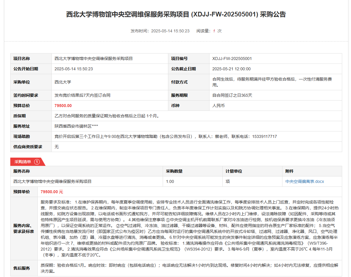8868体育登录博物馆中央空调维保服务采购项目(XDJJ-FW-202505001)竞价采购公告 作者:采购与招标办公室 编辑: 时间:2025-05-14 原公告链接:https://www.ejingcai.com.cn/site/bidding/detail/18217