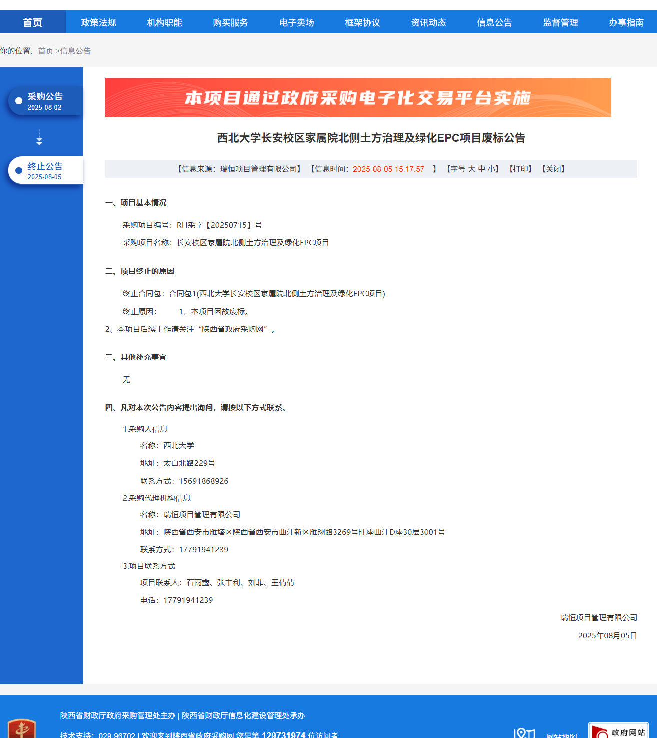 8868体育登录长安校区家属院北侧土方治理及绿化EPC项目废标公告 作者: 编辑:党丹珩 时间:2025-08-05 公告地址:http://www.ccgp-shaanxi.gov.cn/freecms/site/shaanxi/ggxx/info/2025/8a69c8f99860f21c0198790d379441f5.html?noticeType=001004¬iceId=5c6803f0-71ce-11f0-8063-08c0eb20c666