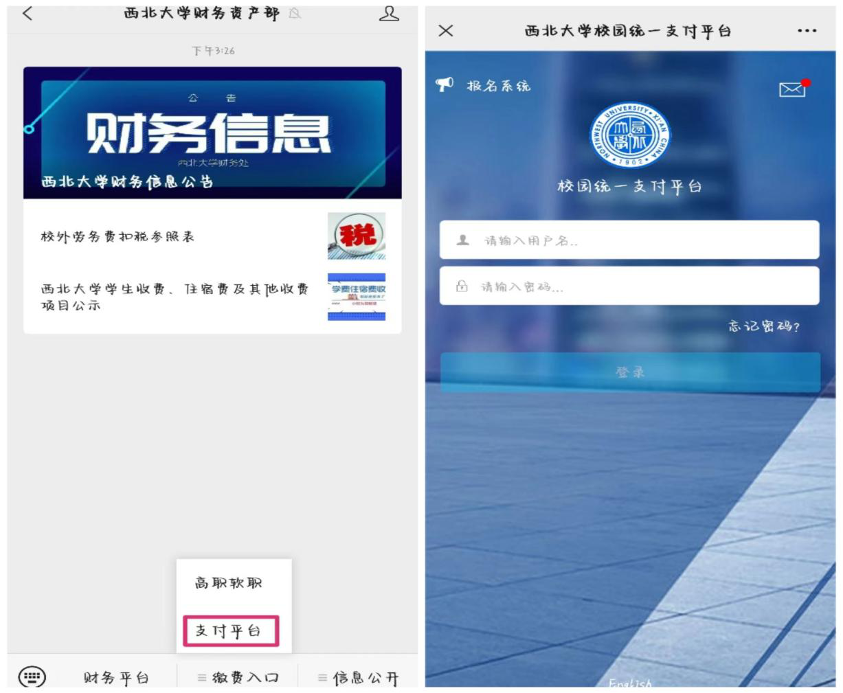 手机端:关注“8868体育登录财务资产部”微信公众号,选择“缴费入口”点击“支付平台”进入。(见下图)