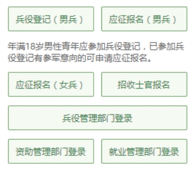登录全国征兵网点击“应征报名(男兵)”进入页面男兵在应征报名之前要先完成兵役登记点击“兵役登记(男兵)”进入操作页面。
