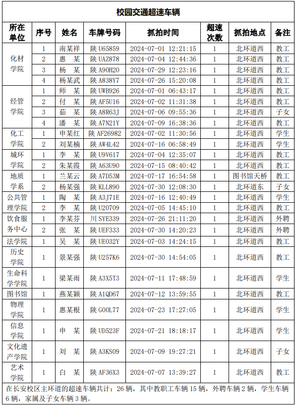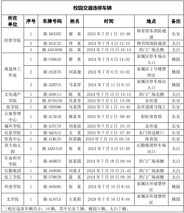 为一步加强校园交通管理,保障校园交通安全有序,维护学校正常的教学、科研和生活秩序以及师生员工的人身财产安全,根据《8868体育登录校园交通安全管理规定》有关要求, 现将2024年7月校园交通违章车辆予以曝光,具体情况如下表。