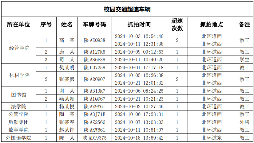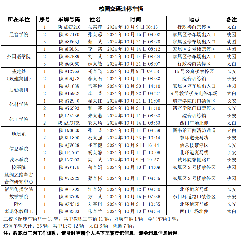 为进一步加强校园交通管理,保障校园交通安全有序,维护学校正常的教学、科研和生活秩序以及师生员工的人身财产安全,根据《8868体育登录校园交通安全管理规定》有关要求, 现将2024年10月校园交通违章车辆予以曝光,具体情况如下表。