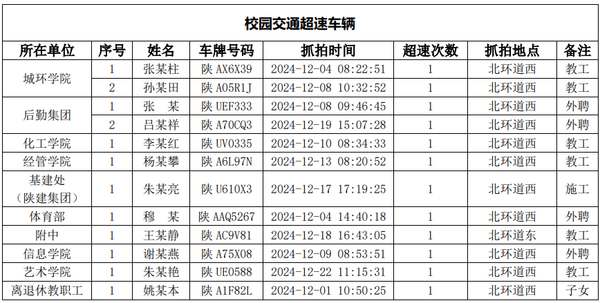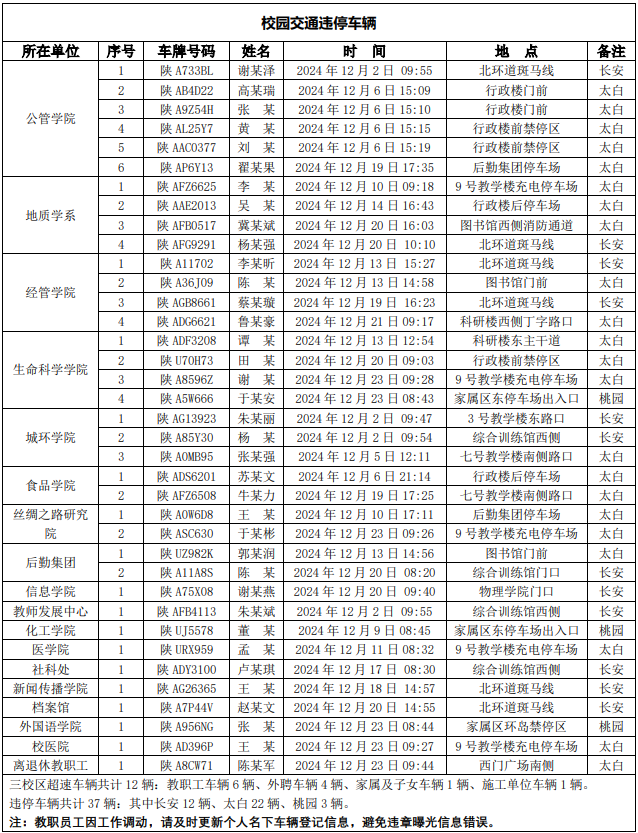 为进一步加强校园交通管理,保障校园交通安全有序,维护学校正常的教学、科研和生活秩序以及师生员工的人身财产安全,根据《8868体育登录校园交通安全管理规定》有关要求, 现将2024年11月校园交通违章车辆予以曝光,具体情况如下表。