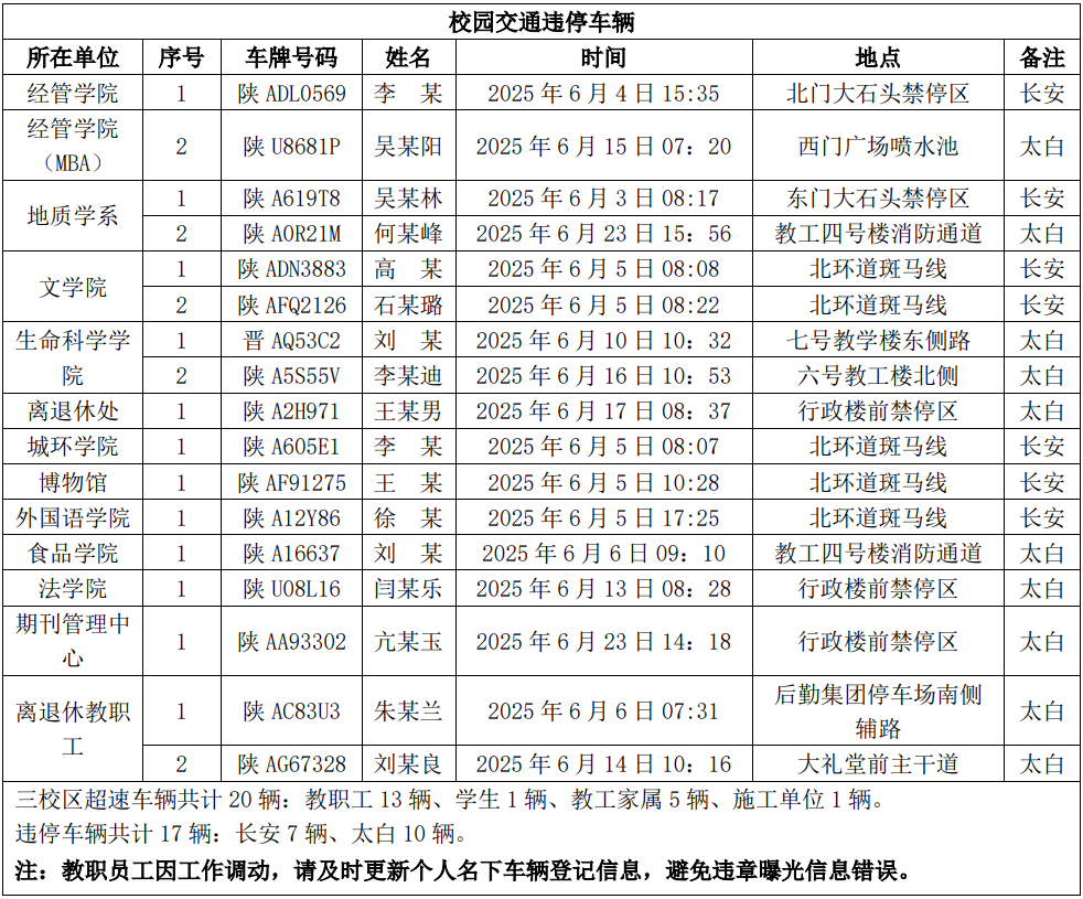 为进一步加强校园交通管理,保障校园交通安全有序,维护学校正常的教学、科研和生活秩序,切实保护师生员工的人身财产安全,根据《8868体育登录校园交通安全管理规定》的相关要求,现将2025年6月校园交通违章车辆予以曝光,具体要求与违章信息如下: