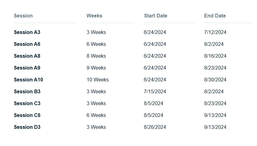 2. 课程时间:提供为期3周的沉浸式加速学习体验,在更短时间获得同等数量学分。该项目提供3个可选时间段,分别为:6月24日-7月12日、7月15日-8月2日、8月5日-8月23日