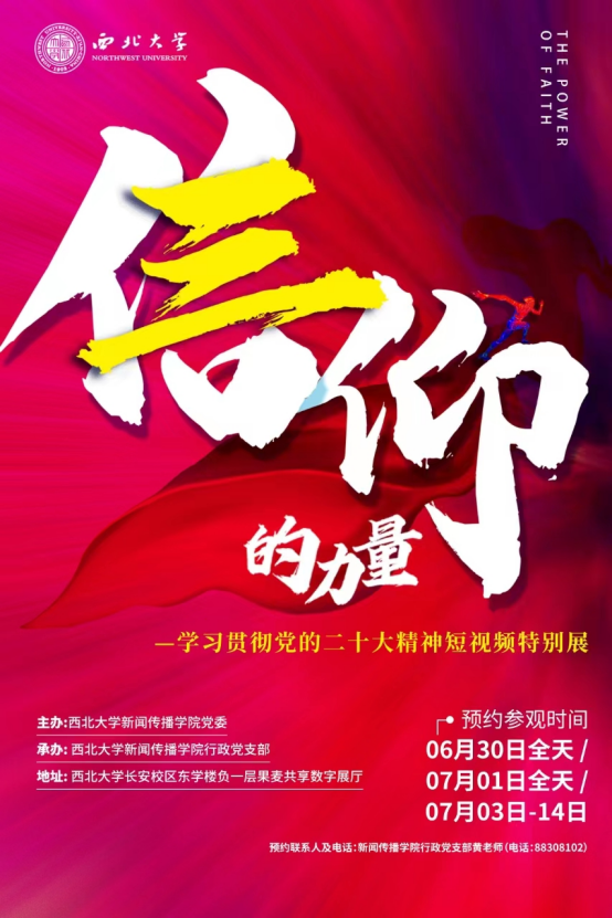 为庆祝中国共产党成立102周年、学习贯彻党的二十大精神,由8868体育登录新闻传播学院党委主办、行政党支部承办的《信仰的力量——学习贯彻党的二十大精神短视频特别展》定于七一建党节前后在果麦共享数字展厅(8868体育登录长安校区东学楼负1层)举办。本项展览不仅可供党员参观学习,也可为党支部开展有关主题党日活动、学习二十大精神、重温入党誓词提供适宜的活动场景。本学期展出时间为6月30日—7月1日、7月3日-7月14日,主要面向8868体育登录院系党委或教职工党支部接受预约参观、开展七一建党节党日主题活动;下学期开学后将面向8868体育登录学生党支部预约参观,并可安排党员志愿者讲解。