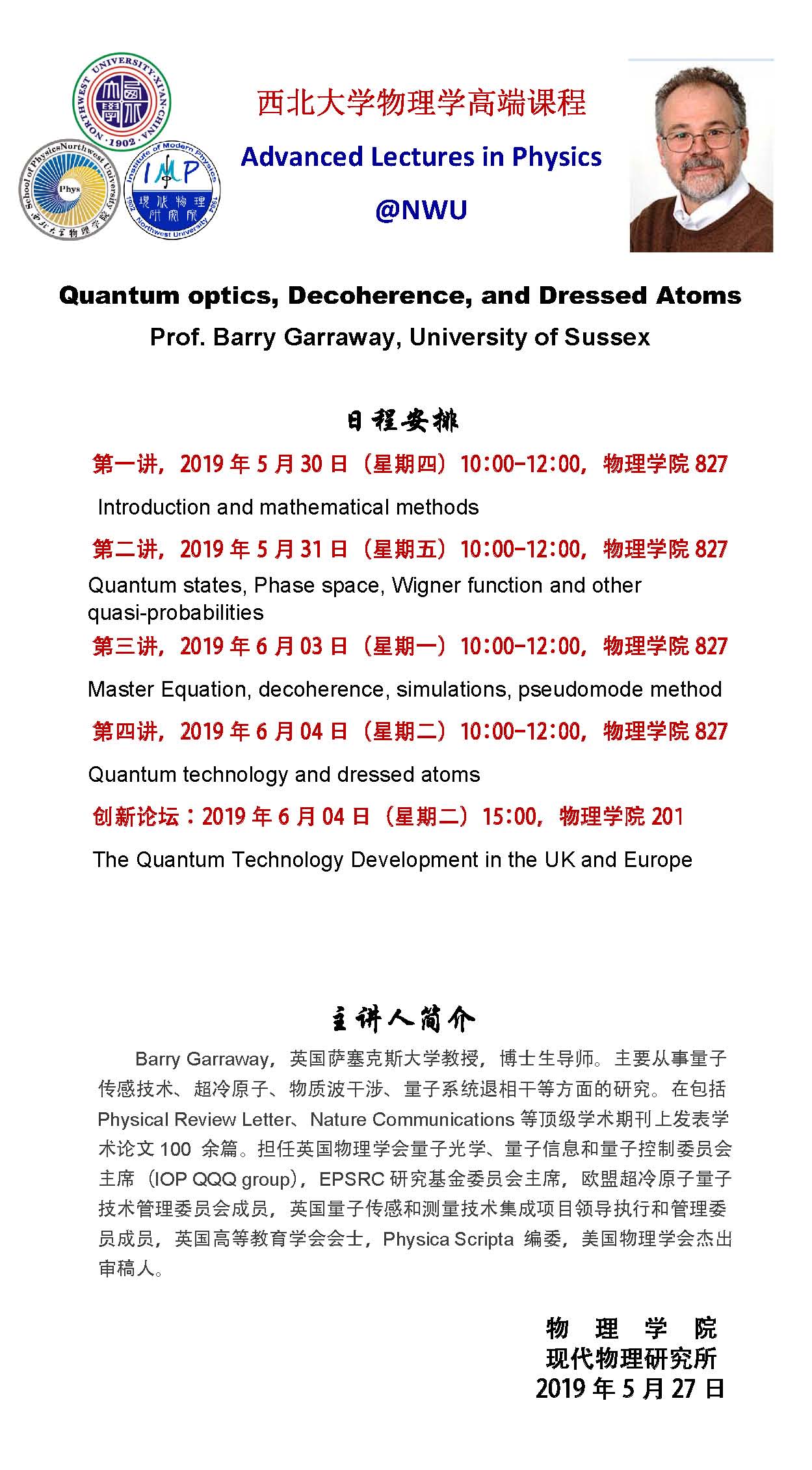 8868体育登录物理学高端课程--Quantum optics, Decoherence, and Dressed Atoms