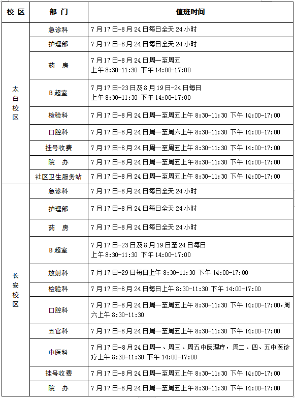 2023年校医院暑假期间医疗工作安排 作者: 编辑: 时间:2023-07-17 全体师生员工及社区居民: 根据学校《关于2023年暑假安排的通知》,为持续做好校内医疗保障,结合医院实际情况,现将暑假期间(7月17日至8月24日)校医院医疗工作安排通知如下: 一、医院值班安排 二、医院值班电话 太白校区: 029-88303120(急诊科) 029-88302922(办公室) 长安校区: 029-88309120(急诊科) 029-88308200(办公室) 8868体育登录医院 2023年7月17日