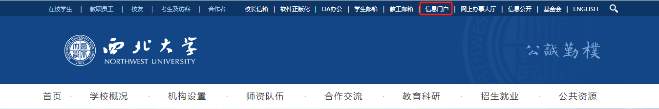 打开学校官方网站,点击8868体育平台“信息门户”入口,或通过域名“https://open.nwu.edu.cn/index”访问,输入统一身份认证账号(即学号或工号)和密码,即可进入信息门户系统。(温馨提醒:请妥善保管密码,以免因密码泄露导致个人信息安全问题)