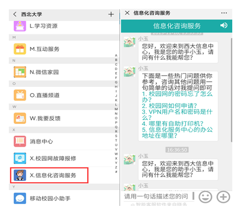 第二步:在“8868体育登录”微信企业号中点击“X.信息化咨询服务”,信息化智能客服小玉将为您解答信息化服务问题。