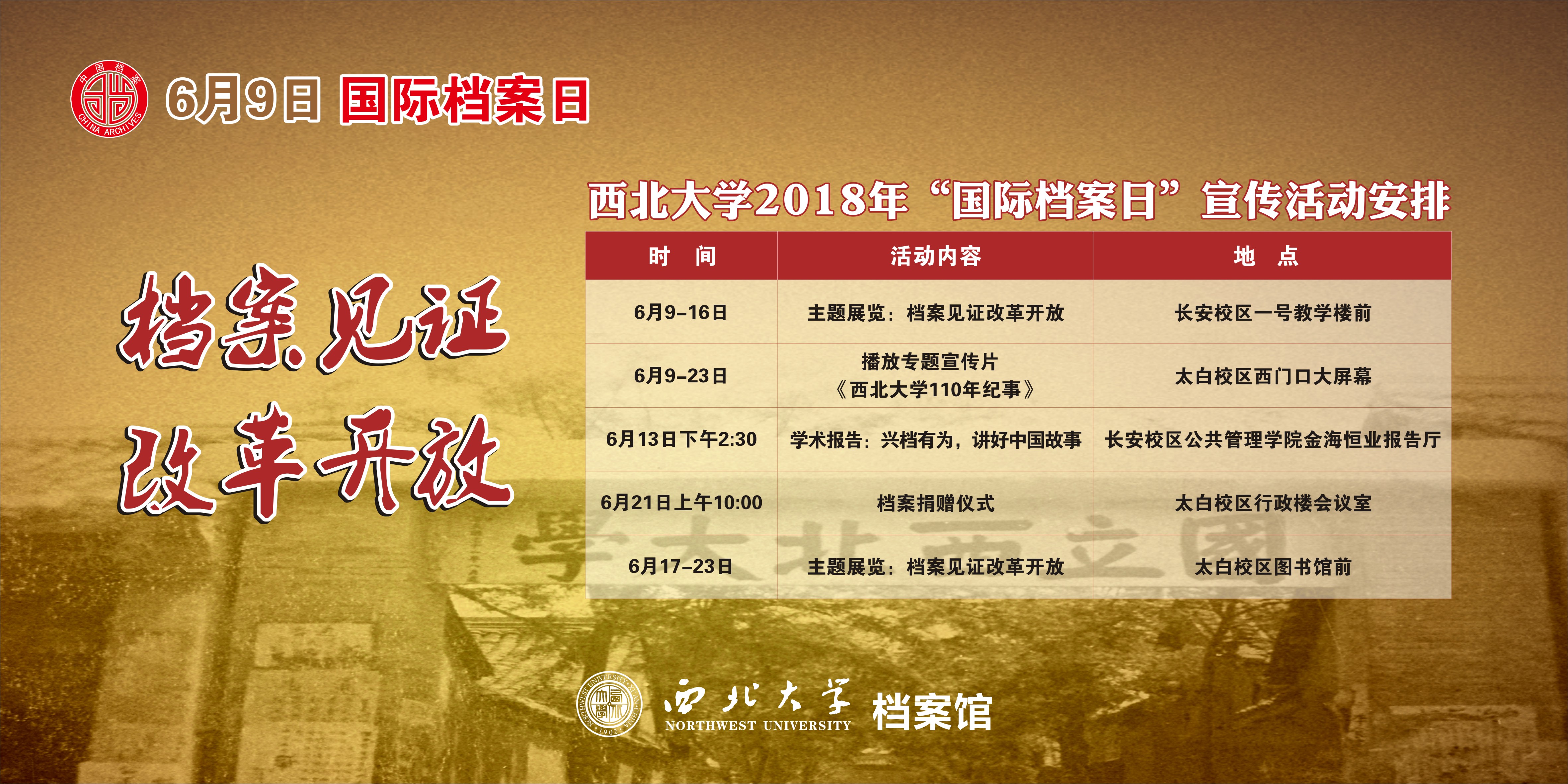 为深入学习宣传贯彻习近平新时代中国特色社会主义思想和党的十九大精神,认真贯彻落实《关于加强和改进新形势下档案工作的意见》(中办发〔2014〕15号)、《关于加强和改进新形势下档案工作的实施意见》(陕办发〔2015〕5号)、《高等学校档案管理办法》(教育部、国家档案局第27号令)和《国家档案局关于开展2018年国际档案日系列宣传活动的通知》等有关精神,纪念改革开放40周年,宣传档案工作“记录历史、传承文明、服务社会、造福人类”的作用和档案“存凭、留史、资政、育人”的功能,讲好“西大故事”,增强全校师生档案意识,进一步推动学校档案工作,助力“双一流”建设,学校举办第四届以“档案见证改革开放”为主题的“国际档案日”系列宣传活动。具体活动安排如下,欢迎广大师生参加!
