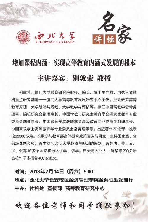 关于举办"名家讲坛"暨"高等教育论坛"(第十三期)的通知 作者: 编辑: 时间:2018-07-09 08:48 校内各有关单位:8868体育登录名家讲坛暨高等教育论坛(第十三期)即将举行,现将具体情况通知如下:讲座题目:增加课程内容:实现高等教育内涵式发展的根本主讲嘉宾:别敦荣 教授讲座时间:7月14日(周六)9:00讲座地点:8868体育登录长安校区经济管理学院金海恒业报告厅主办单位:社科处、宣传部、高等教育研究中心欢迎各位老师和同学踊跃参加!