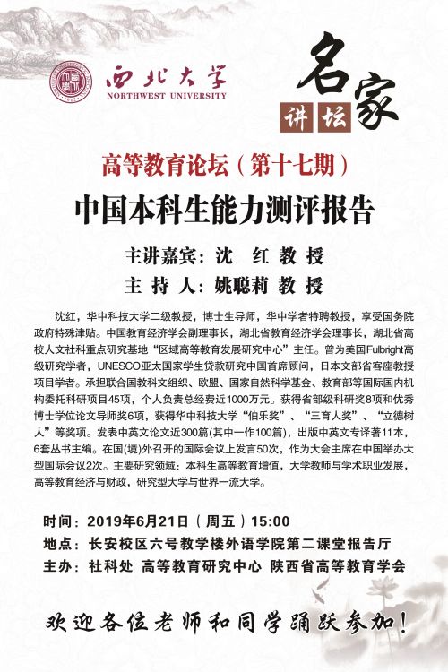 关于举办"名家讲坛"暨"高等教育论坛"(第十七期)的通知 作者: 编辑: 时间:2019-06-19 10:43 校内各有关单位:8868体育登录名家讲坛暨高等教育论坛(第十七期)即将举行,现将具体情况通知如下:讲座题目:中国本科生能力测评报告主讲嘉宾:沈 红 教授讲座时间:6月21日(周五)15:00讲座地点:长安校区六号教学楼外语学院第二课堂报告厅主办单位:社科处、高等教育研究中心、陕西省高等教育学会欢迎各位老师和同学踊跃参加!