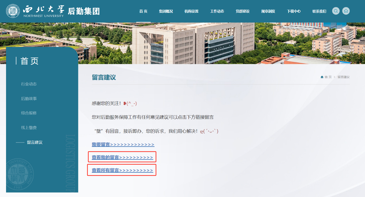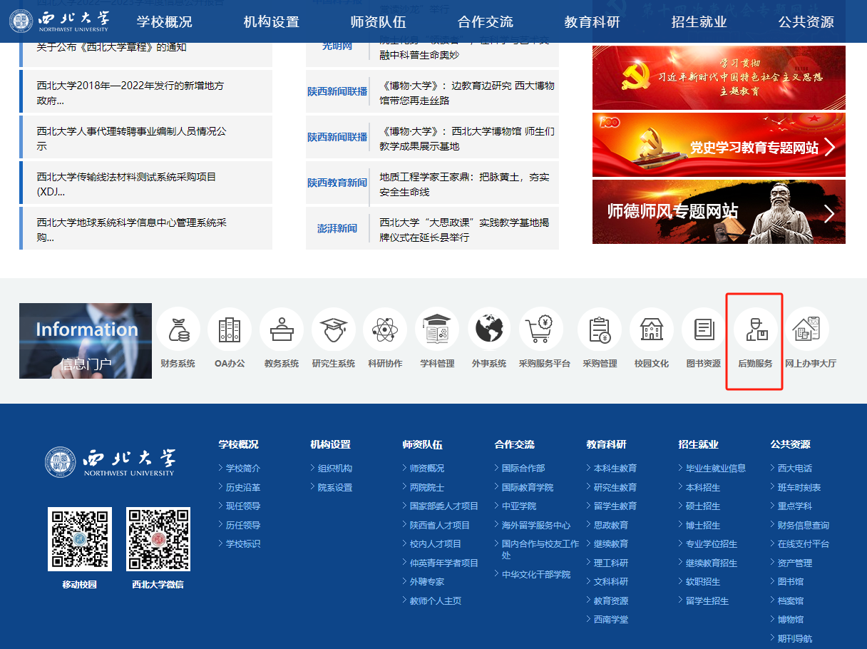 1.通过PC端或手机端,进入学校官网,下滑至网页末端,点击“后勤服务”,进入后勤集团官方网站(https://hqjt.nwu.edu.cn/);
