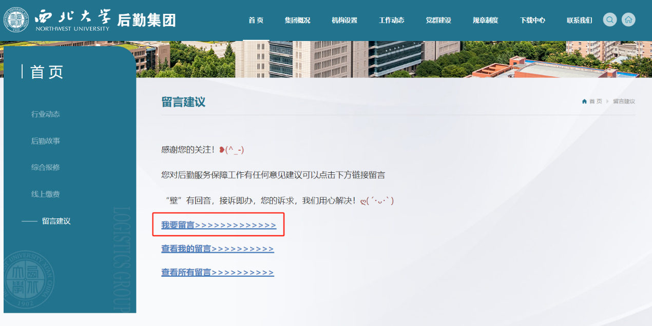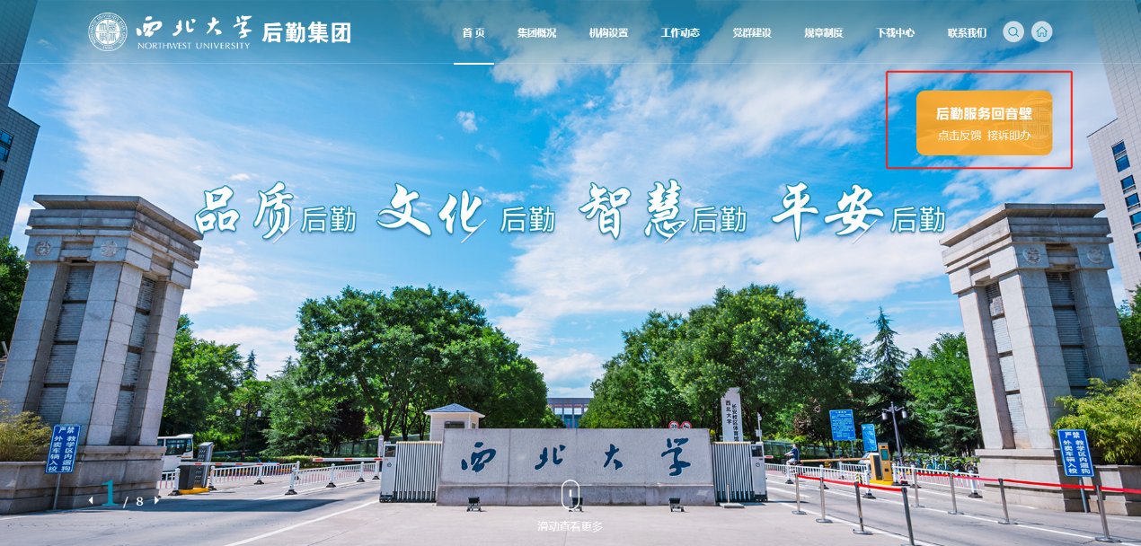 2.进入后勤集团网站8868体育平台后,点击右上角“后勤服务回音壁”;