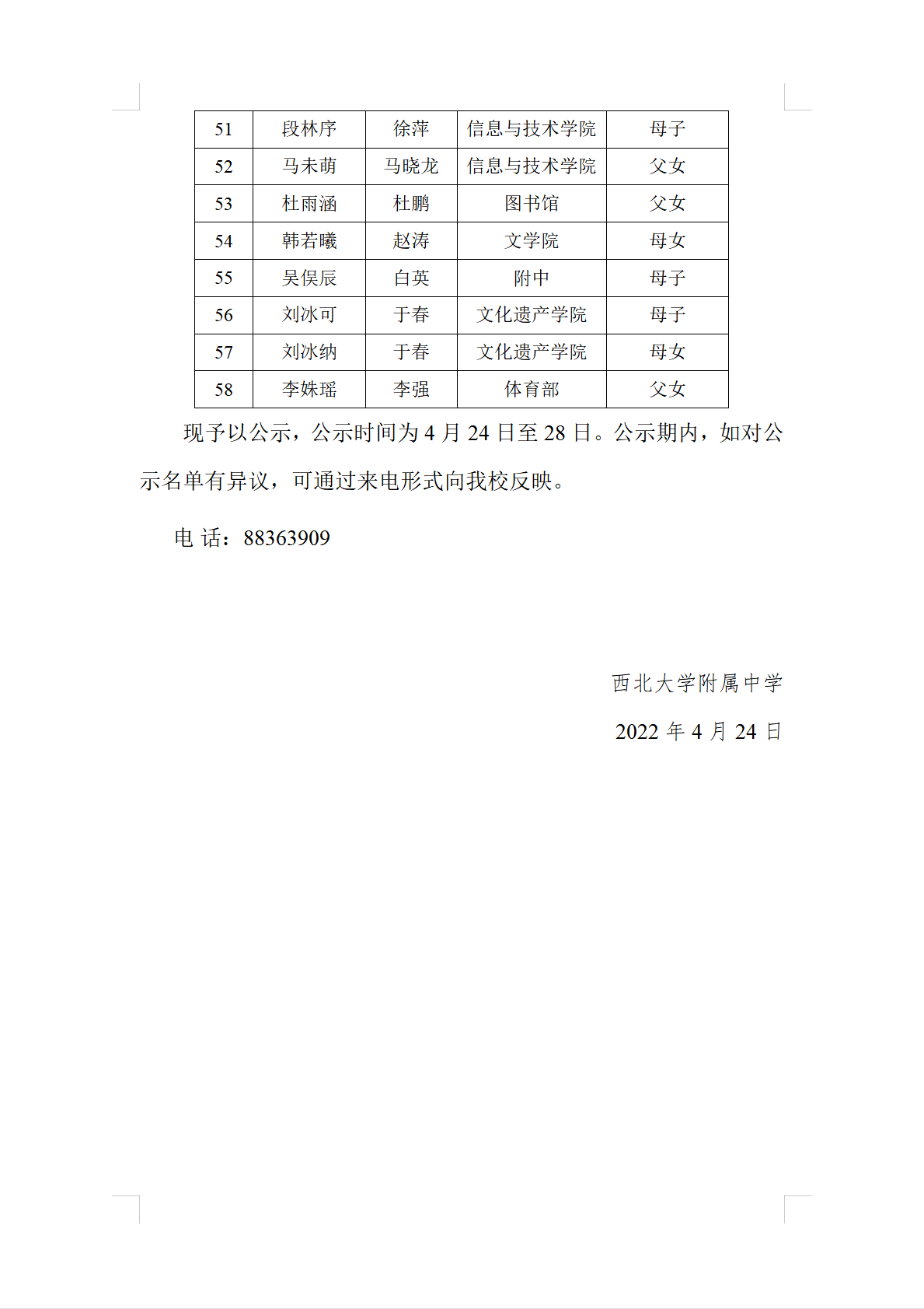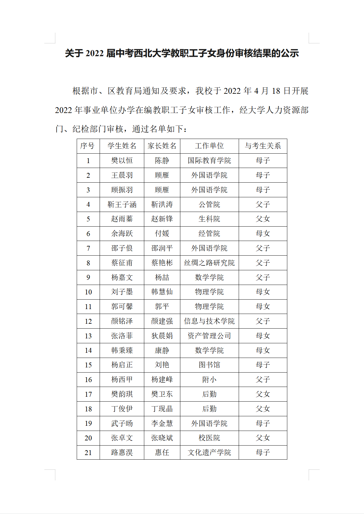 关于2022届中考8868体育登录教职工子女身份审核结果的公示