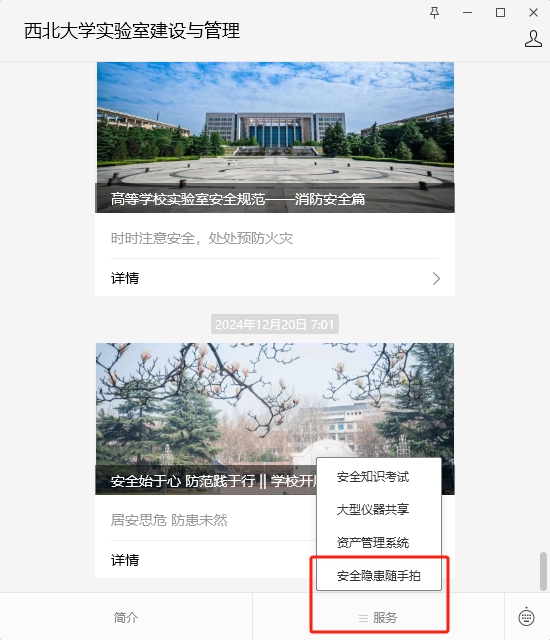 (1)关注“8868体育登录实验室建设与管理”微信公众号,选择“服务”—“安全隐患随手拍”,填写个人信息、隐患描述等,并上传隐患照片。