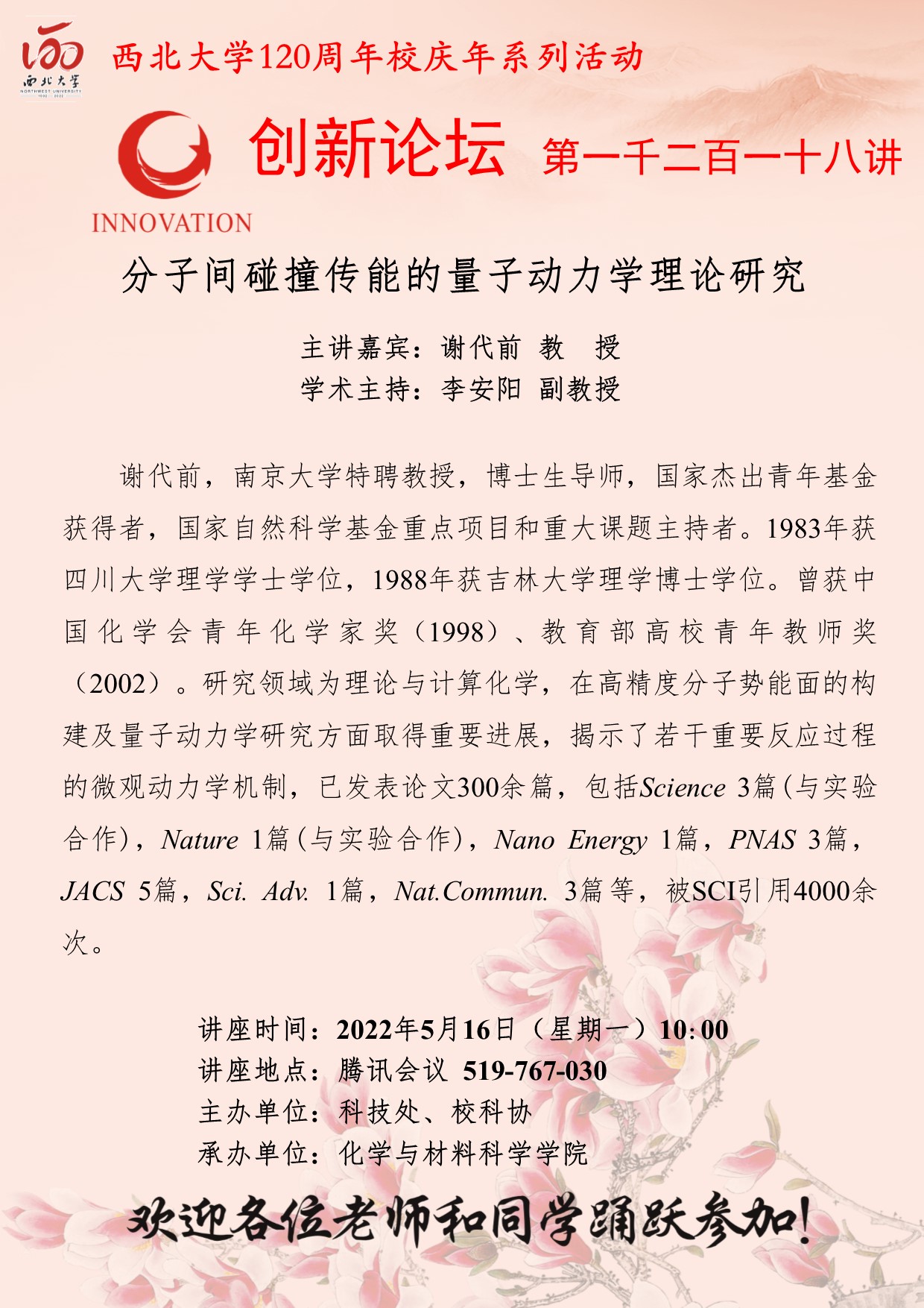 8868体育登录创新论坛第一千二百一十八讲暨120周年校庆年系列活动:分子间碰撞传能的量子动力学理论研究