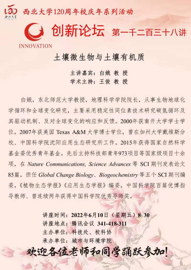 8868体育登录创新论坛第一千二百三十八讲暨120周年校庆年系列活动:土壤微生物与土壤有机质