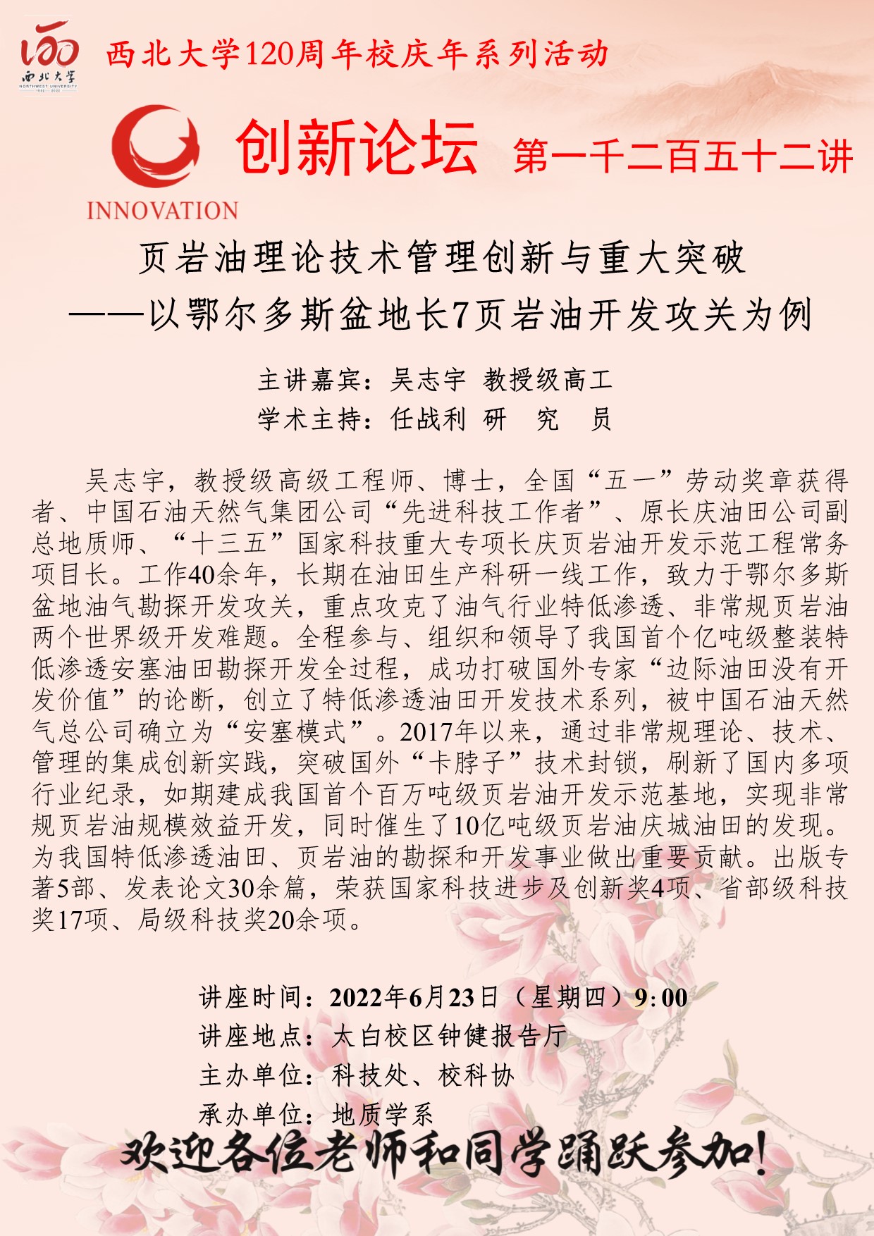 8868体育登录创新论坛第一千二百五十二讲暨120周年校庆年系列活动:页岩油理论技术管理创新与重大突破——以鄂尔多斯盆地长7页岩油开发攻关为例 作者:吴志宇 教授级高工 编辑: 时间:2022-06-21
