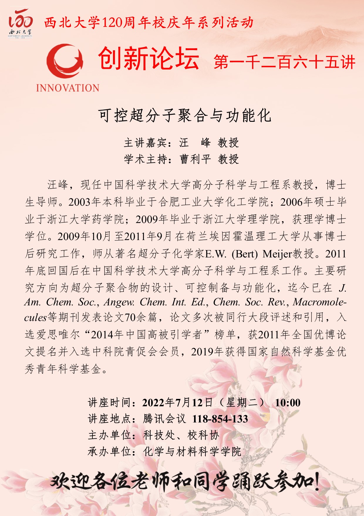 8868体育登录创新论坛第一千二百六十五讲暨120周年校庆年系列活动:可控超分子聚合与功能化