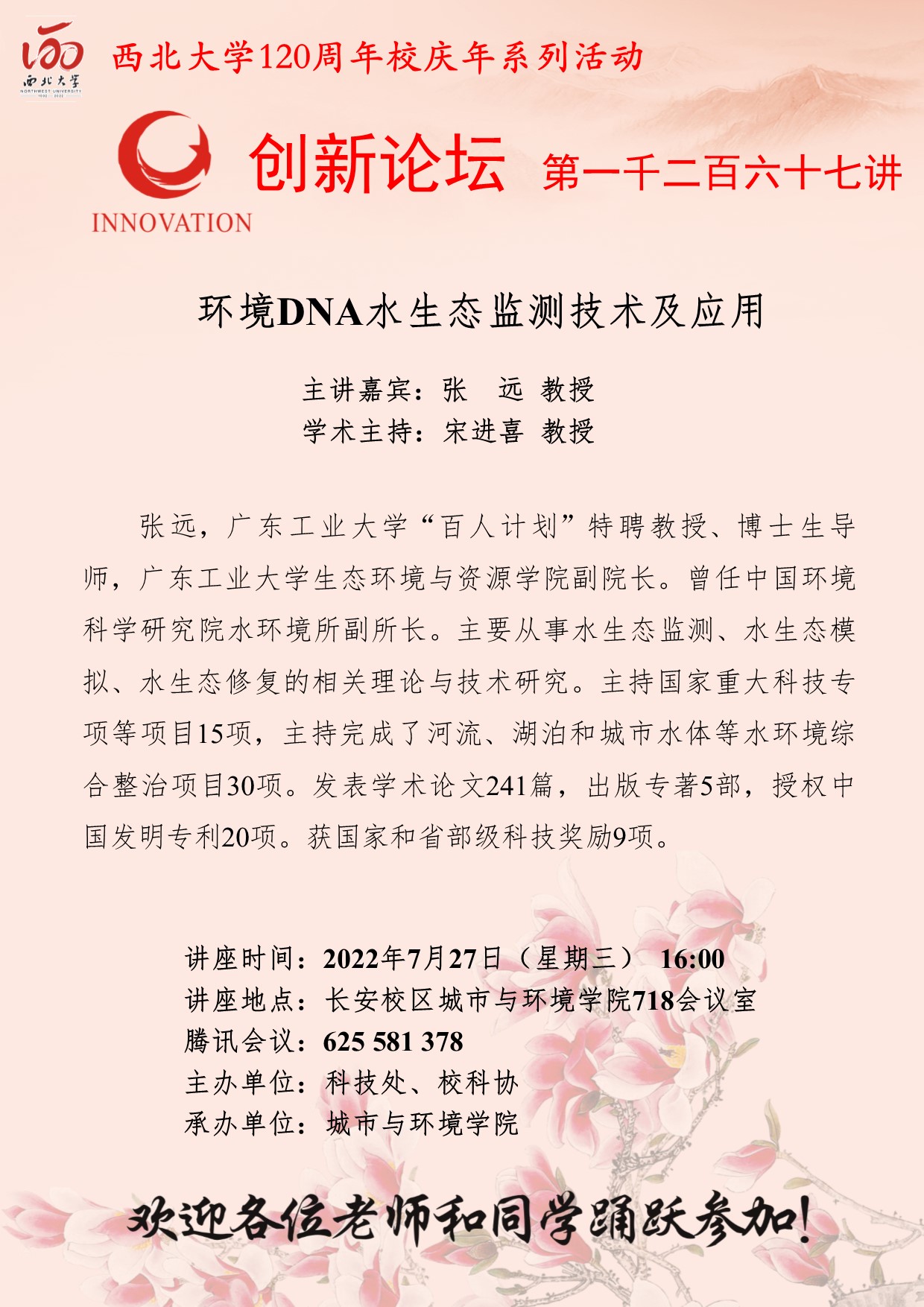 8868体育登录创新论坛第一千二百六十七讲暨120周年校庆年系列活动:环境DNA水生态监测技术及应用
