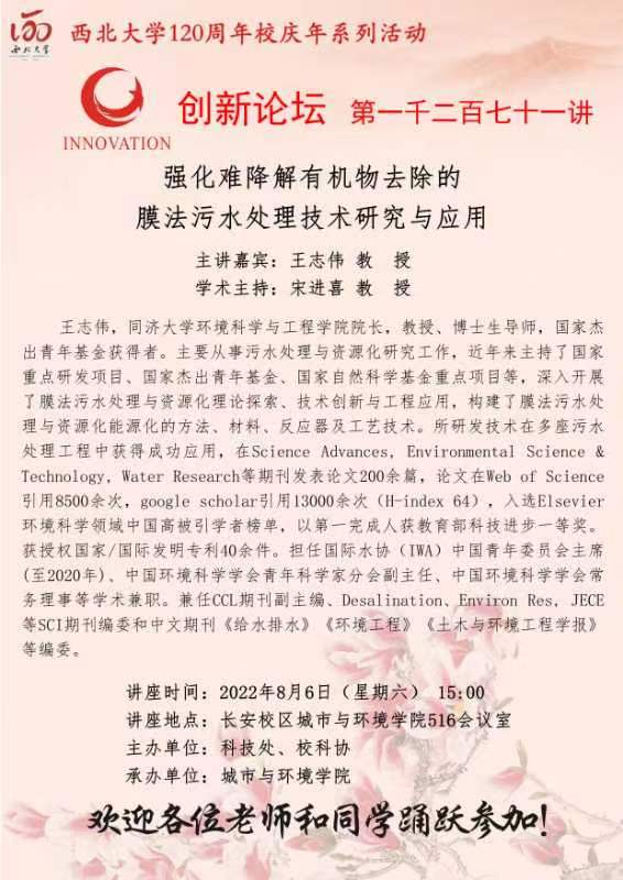8868体育登录创新论坛第一千二百七十一讲暨120周年校庆年系列活动:强化难降解有机物去除的膜法污水处理技术研究与应用