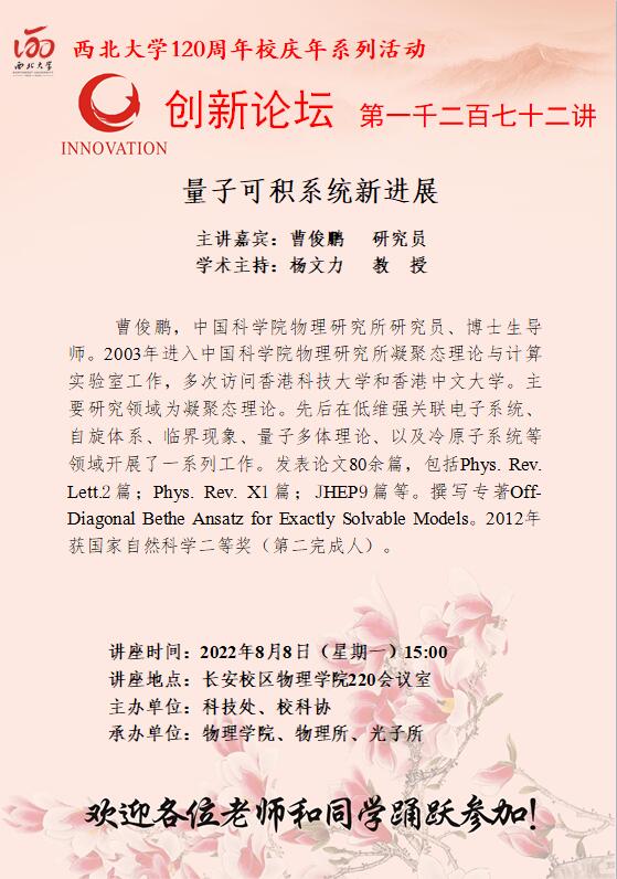 8868体育登录创新论坛第一千二百七十二讲暨120周年校庆年系列活动:量子可积系统新进展
