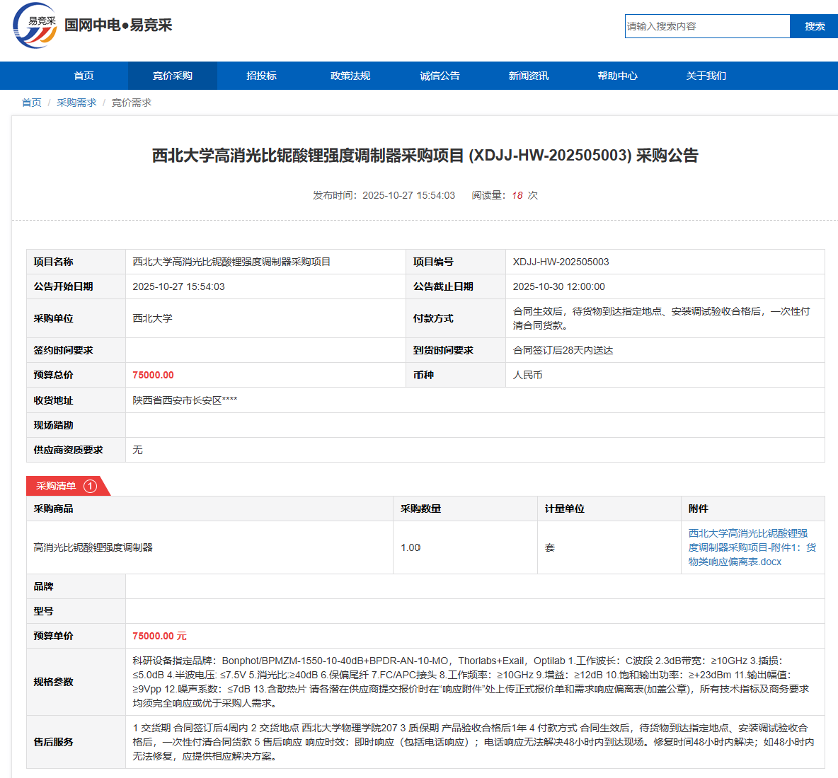 8868体育登录高消光比铌酸锂强度调制器采购项目(XDJJ-HW-202505003)竞价采购公告