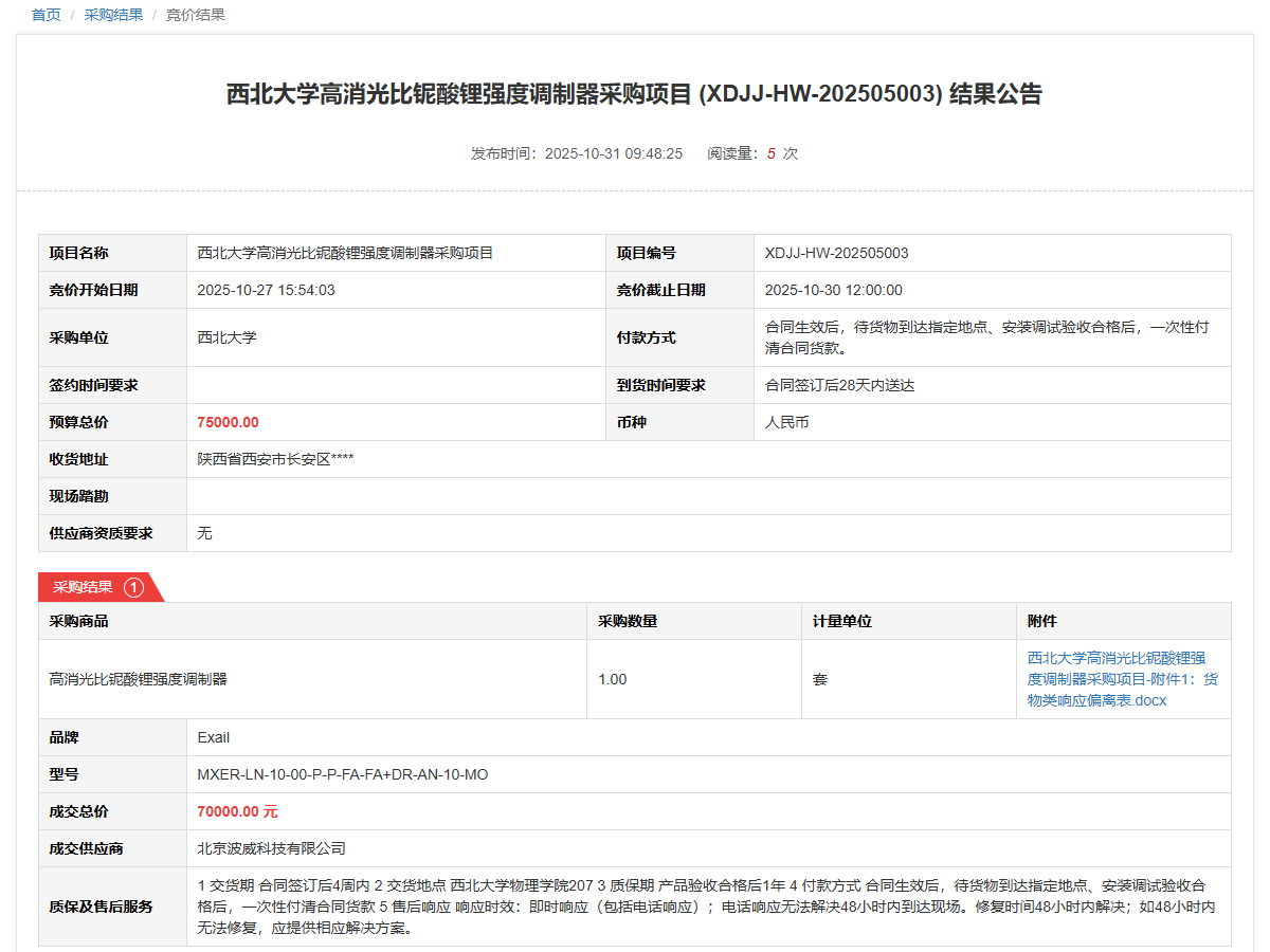 8868体育登录高消光比铌酸锂强度调制器采购项目(XDJJ-HW-202505003)竞价结果公告