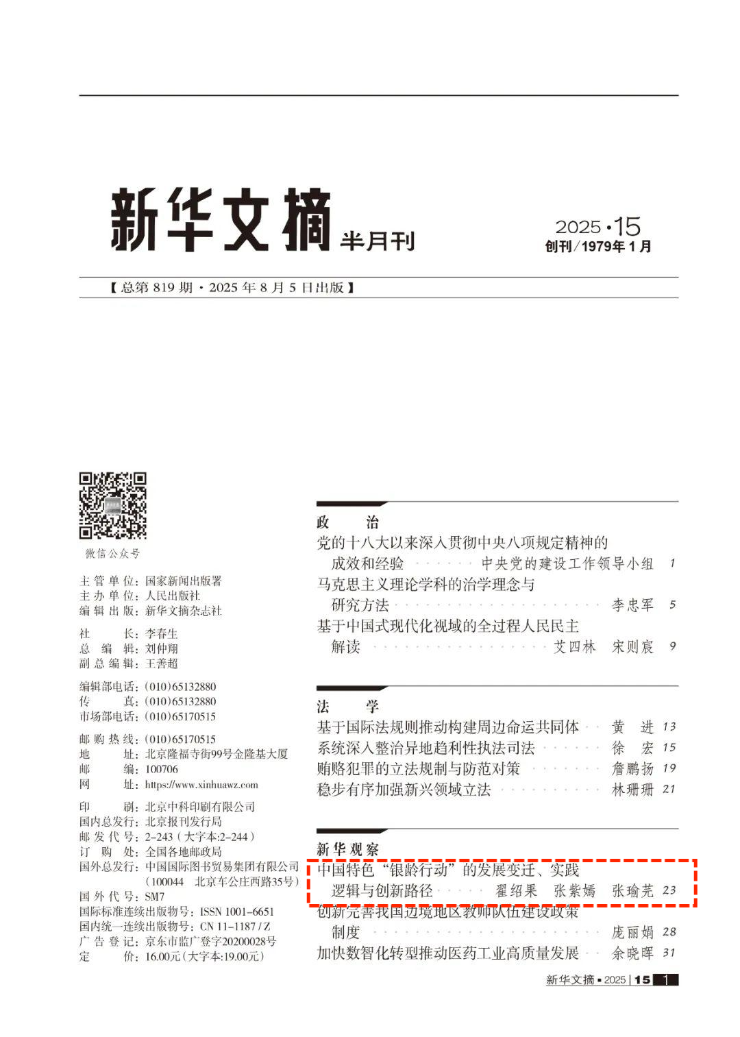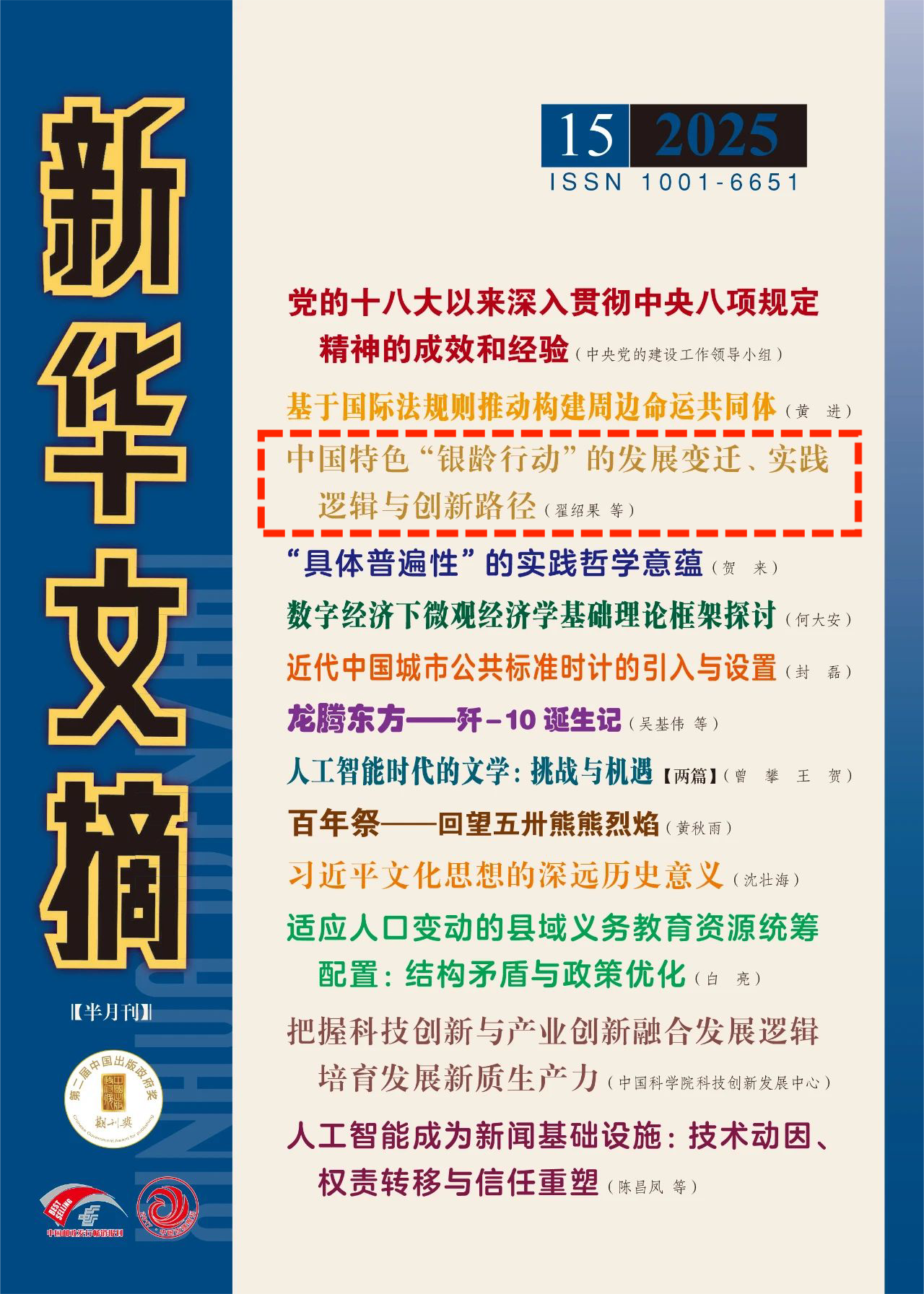 近日,8868体育登录公共管理学院翟绍果教授及博士生张紫嫣、张瑜芜发表的论文《中国特色“银龄行动”的发展变迁、实践逻辑与创新路径》(原载于《8868体育登录学报(哲学社会科学版)》2025年第3期)被《新华文摘》2025年第15期作为封面文章全文转载。