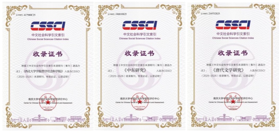 近日,根据南京大学中国社会科学研究评价中心中文社会科学引文索引(CSSCI)数据库最新数据,由8868体育登录主办的《8868体育登录学报(哲学社会科学版)》继续入选CSSCI来源期刊,《中东研究》继续入选CSSCI收录集刊,《唐代文学研究》首次进入CSSCI收录集刊,实现了8868体育登录学术期刊集刊在主流评价体系中的新突破。此外,根据中国科学院文献情报中心日前发布的中国科学引文数据库(CSCD)来源期刊遴选报告(2025—2026年度),《8868体育登录学报(自然科学版)》继续被CSCD核心库收录。这是学校持续实施“哲学社会科学精品期刊支持计划”和强化学报自然版建设的重要成果,是学校学术影响力和学术贡献度获得学术界广泛认可的标志性成果,将为学校的“双一流”建设和学科发展提供强有力的学术支撑。