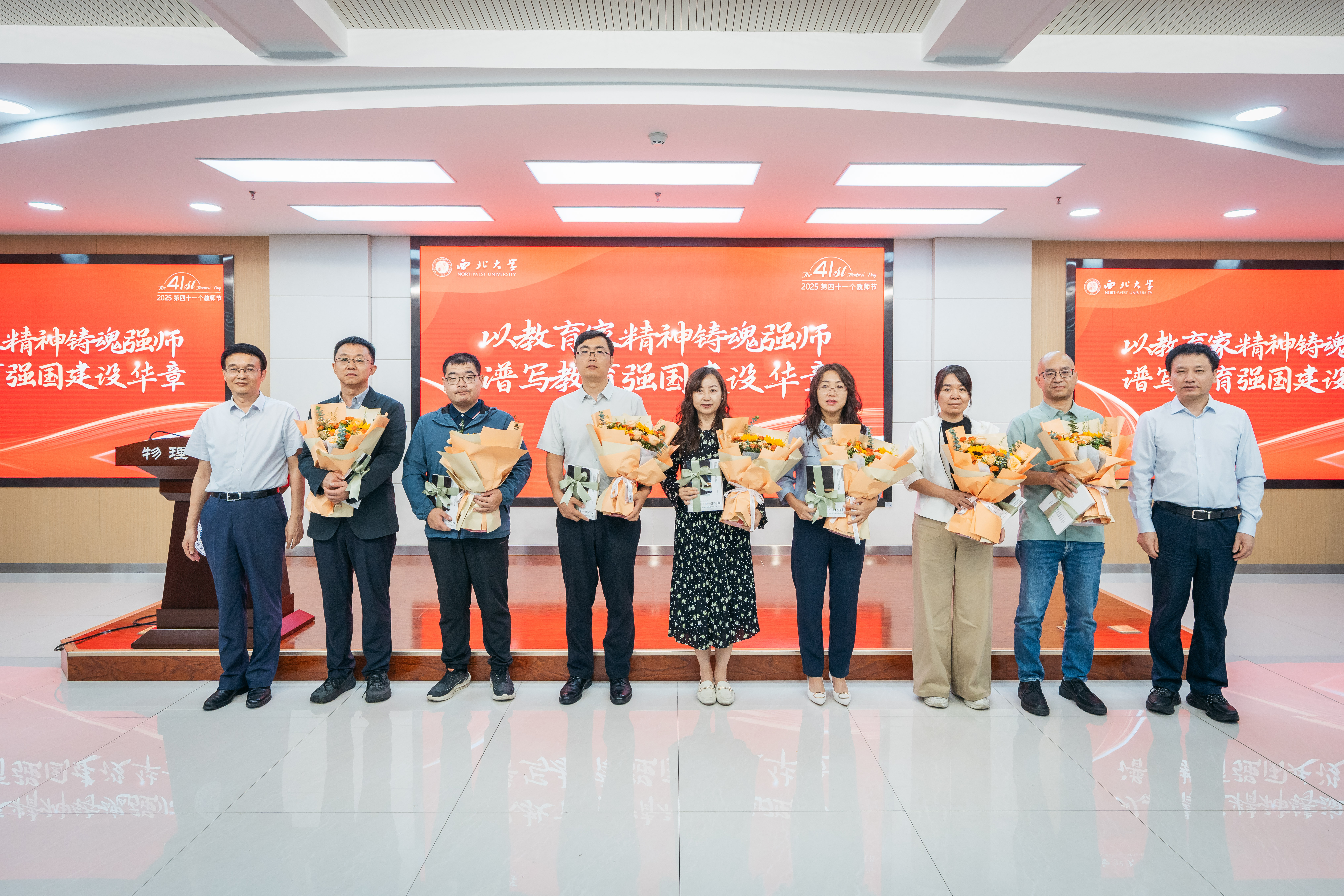 与会校领导为获奖教职工代表赠送侯伯宇教授传记——《十一维空间:物理学家侯伯宇的多维人生》。学生代表向获奖教师献花并致以节日祝福。